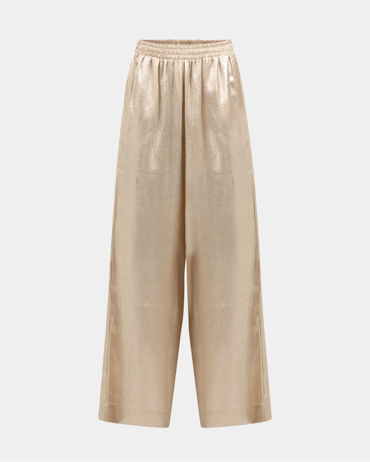 De Knit-ted Blake pants is een wide leg broek met een glanzende stof die net wat extra geeft, zonder overdreven te zijn. De gouden tint sluit mooi aan bij feestelijke momenten, maar laat zich ook goed combineren met rustige knitwear voor het najaar en winterseizoen.