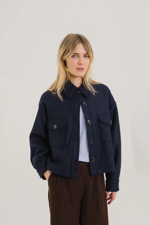 De Mia jas van Sacrécoeur is een kort, losvallend jasje van zachte navykleurige wol. Ongevoerd voor een lichte, comfortabele pasvorm ideaal om het hele seizoen door te dragen. De klassieke kraag, opgestikte borstzakken met klep en brede manchetten met knoopsluiting geven het ontwerp een verfijnde, maar ontspannen uitstraling.